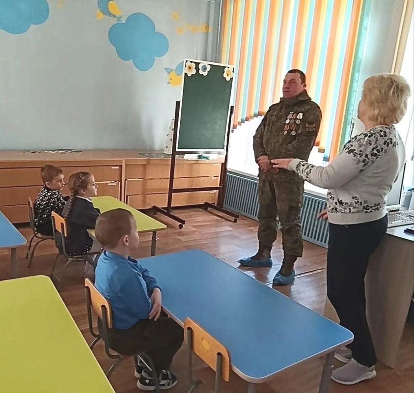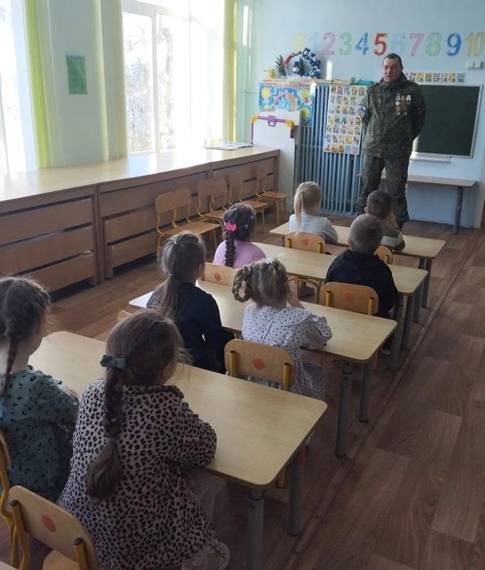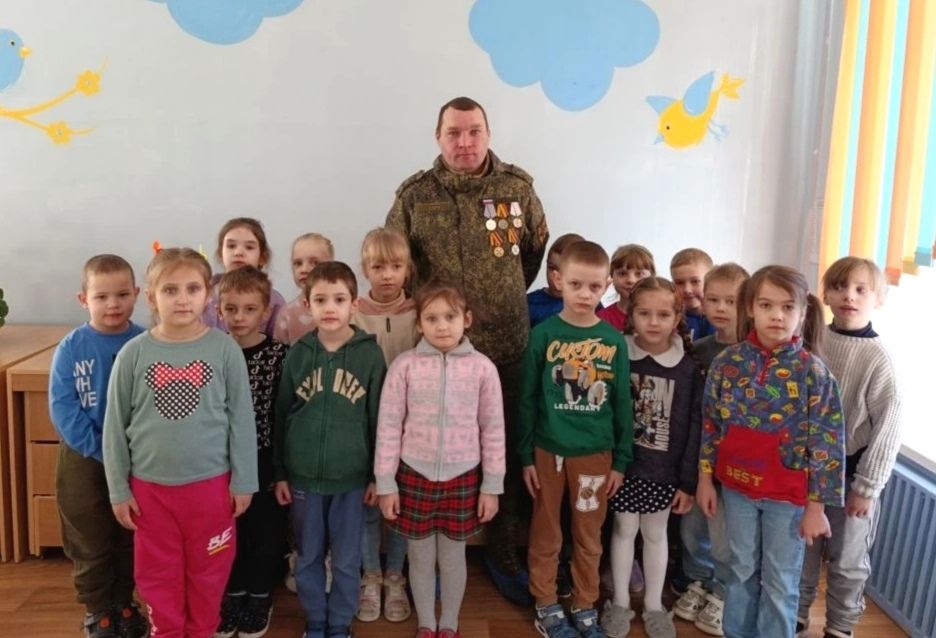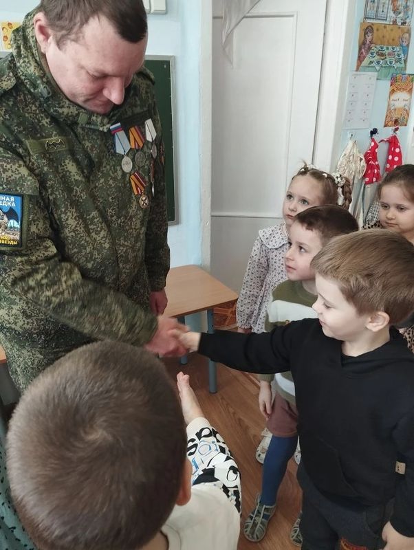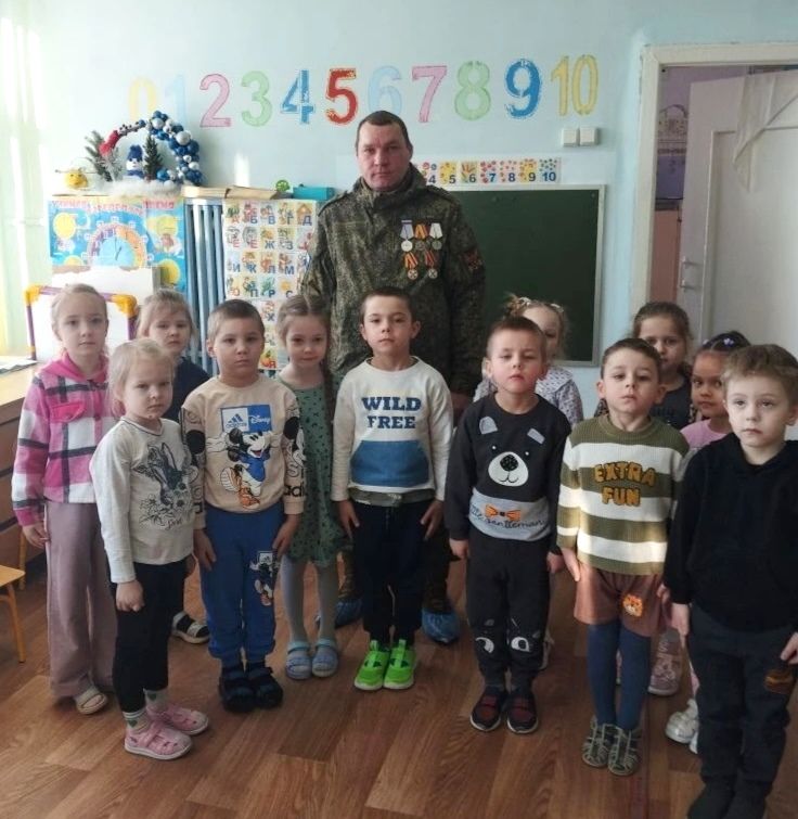 В нашем детском саду систематически ведется работа с дошкольниками по патриотическому воспитанию. Она реализуется во всех видах образовательной деятельности и режимных моментах. Проводятся различные мероприятия, игры, занятия по воспитанию любви к Родине и чувства гордости за свою страну. В преддверии замечательного праздника Дня защитника Отечества ребята подготовительной группы «Почемучки» и старшей группы «Колокольчик» (воспитатели Усова Л. Г. и Нешкова Н.С.) встретились с участником СВО, нашим земляком Казаковым С.И.